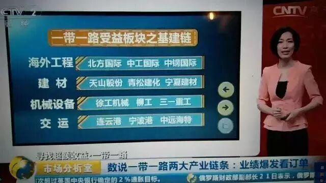 受益板块众多,我们不妨把它们串成两个链条,一个链条是基建链,主要包括海外工程、建材、机械设备、交运等,这些企业已经进入了“”战略带来的业绩兑现期,各个板块代表公司有(图版)北方国际、天山股份、徐工机械、连云港等等。另外一个链条叫做优势产能输出链,包括高铁、通信设备、电力设备等等,各自代表性的公司有中国中车、中兴通讯、亨通光电、特变电工。
