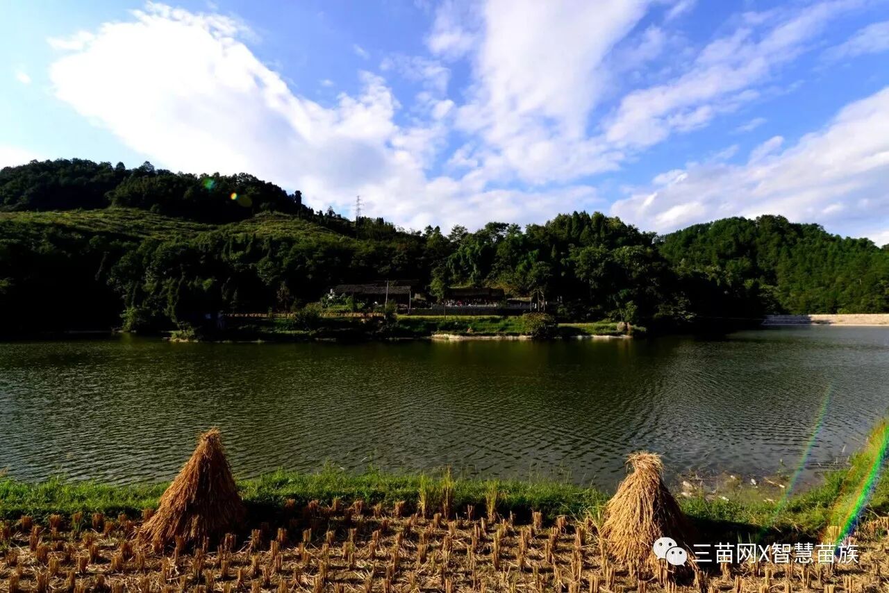 岸边的房舍多是木楼,懒洋洋的小猫小狗在林荫下打着哈气。一行翠绿的鸟儿在塘中划过,消失在湖池的另外一角。板栗树上的板栗此时裂开了口,栗子已吊落了下来。冬瓜也成熟了,毛茸茸的泛起白灰。几株矮小的的古桂树,零星开着花朵,香飘洒在村落和池塘之间。
