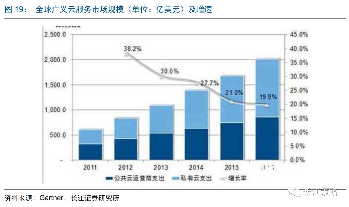 科技巨头云计算业务的好于预期高速增长印证了行业潜在巨大的发展趋势。根据Gartner的统计预测数据,2015年全球广义云服务市场规模近1700亿美元,预计2017年将达到2442亿美元,未来几年会继续保持15%以上的速度增长。飞速增长的市场背后为我国云计算厂商也创造了很多发展机会。