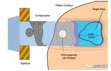 图2:利用双散射或者均匀扫描的传统质子治疗仪。用光圈来形成束流,且利用补偿器使得远端剂量与靶形状一致;用于校正靶的远端束流形状的补偿器(1),倾斜入射的束流(2)以及在束流传输过程中的不均匀性(3)。