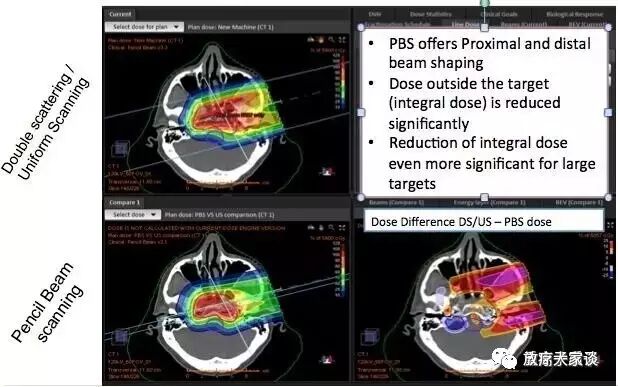 图4:使用DS/US与PBS单质子治疗剂量的差异比较。底部右图显示的是使用DS/US技术对靶部位外面的非需要剂量。