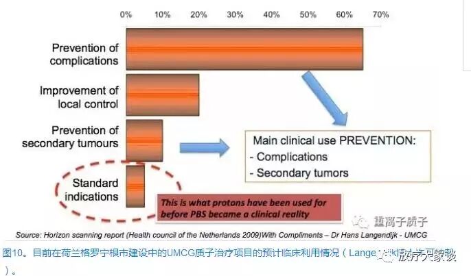 质子治疗的未来非常乐观。PBS在临床治疗上的直接积极作用无可非议。1996年第一位患者在瑞士保罗谢尔研究取得了明显的治疗效果[41],当PBS在全球范围内广泛应用于临床时,这种治疗作用就显得更为明显。荷兰格罗宁根大学医学中心(UMCG)的临床团队在Hans Langendijk博士的领衔下,成功实现了PBS技术在临床实践中的应用。他们团队在UMCG针对质子治疗的需求进行了一次深入的调查研究,通过分析在UMCG接受治疗的患者队列研究结果,分析回顾了正常组织并发症的发生率[42]。图10是在UMCG基于质子治疗系统预测未来PBS利用率的条形图(Langendijk博士许可转载),这个治疗系统目前还在建设中[42]。有意思的是75%使用PBS技术是为了预防并发症和继发性癌症。只有计划治疗病例总数的20%的患者的治疗目的主要是对肿瘤更好的局部控制,而仅仅只有5%是针对标准适应症的治疗。在PBS技术实现临床应用之前,质子治疗或多或少都被运用于治疗标准的适应症。换言之,图10中所列的标准适应症与图6虚线左侧所列适应症相同。这就意味着,PBS潜在的临床作用已经远远超出了质子治疗早期所期望或预测的那样。
