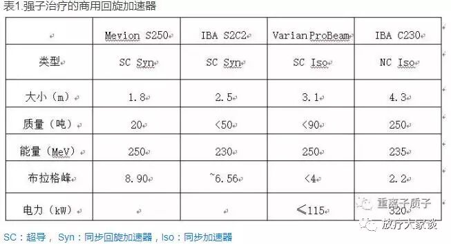 2000年初,研发人员采用ACCEL技术(2005年 被Varian收购)建造了第一台超导回旋加速器,超导技术的应用就正式进入了质子治疗领域。自那时以来,几家公司已经开始研制超导同步回旋加速器以减小加速器的尺寸和成本。如Mevion的同步回旋加速器,重量小于20吨。表1列出了常见的商业用途回旋加速器和同步回旋加速器。IBA C230设备是室温的同步回旋加速器,且已经在世界范围内大多数的IBA设施进行安装使用。