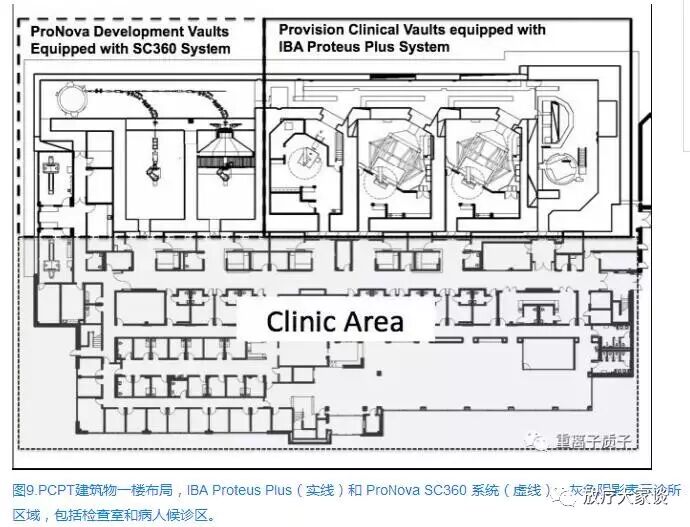 美国诺克斯维尔的 Provision质子治疗中心(PCPT)是一家先进的质子治疗中心,配备传统的IBA治疗系统,并有三间质子治疗室。PCPT也购买了第一套ProNova SC360治疗系统,与IBA治疗系统被安装于同一建筑物中。SC360系统已于2016年12月通过了FDA认证。PCPT计划于2016年年底使用SC360治疗系统开始治疗患者。PCPT建筑布局图见图9。从平面图来看,传统的IBA治疗系统和ProNova治疗系统的占地面积差异显而易见。