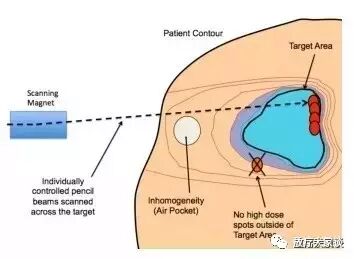 图3:PBS是采用独立控制的加速的质子的小的笔形束流在三维空间来覆盖靶目标。用快速扫描电磁铁来使的笔形束扫描技术离轴扫描。直到每个点受到所需剂量的扫描后,束流才被固定在扫描点上。