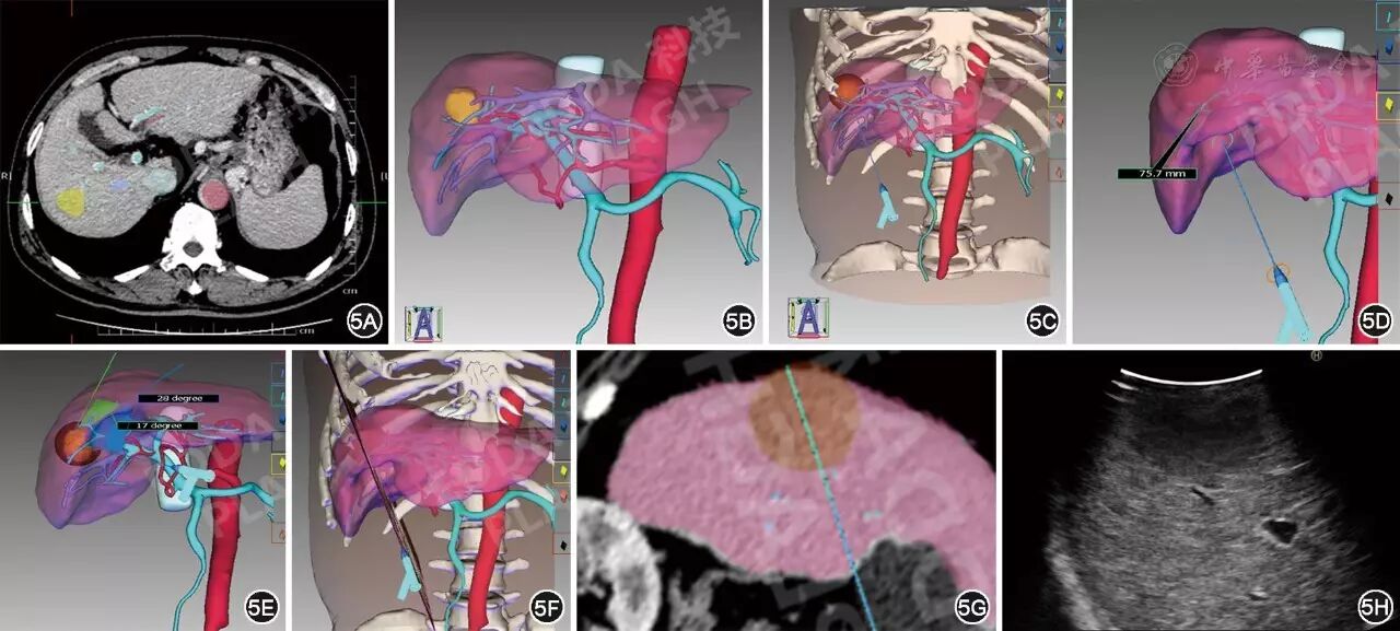 图5 IQQA®-Liver肝脏评估和介入治疗计划辅助系统对肝右后叶上段肿瘤行腹腔镜下射频消融术手术规划和术中超声检查图像:5A示术前影像学检查图像,可见肝脏肿瘤;5B示肝脏和肿瘤的三维重建图像,可见肿瘤位于右后叶上段,直径约25 mm,被门静脉右后支分支围绕;5C示规划进针的三维图像:规划射频针于右侧肋缘下、右锁骨中线进针,并调整针尖位置以使射频范围完全包括肿瘤及安全边界;5D示模拟进针距离的三维重建图像:经肝脏表面进针75.7 mm;5E示模拟进针角度的三维重建图像:针道与水平面角度为28°,与矢状面角度为17°;5F示三维重建图像中经针道的重画割面;5G示三维重建中预计的超声图像;5H示术中腹腔镜超声探查图像,超声探头于右侧肋缘下、右锁骨中线12 mm一次性Trocar进入
