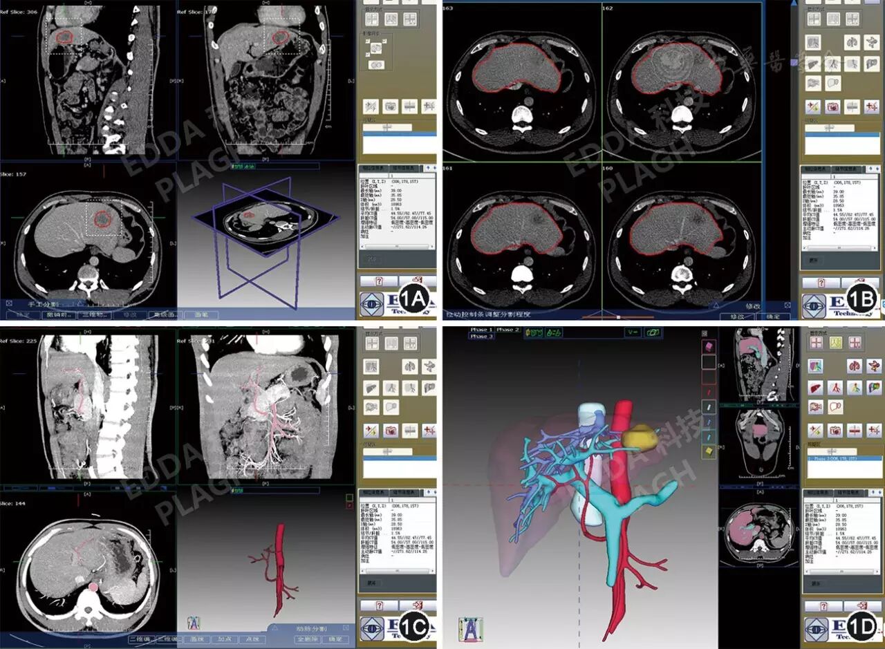 图1 IQQA®-Liver肝脏评估和介入治疗计划辅助系统对肝脏、肿瘤、重要管道进行重建的流程图:1A 示提取病灶信息;1B示手动修改肝脏的自动划分结果;1C示肝内管道信息的提取;1D示完整的肝脏三维重建图像