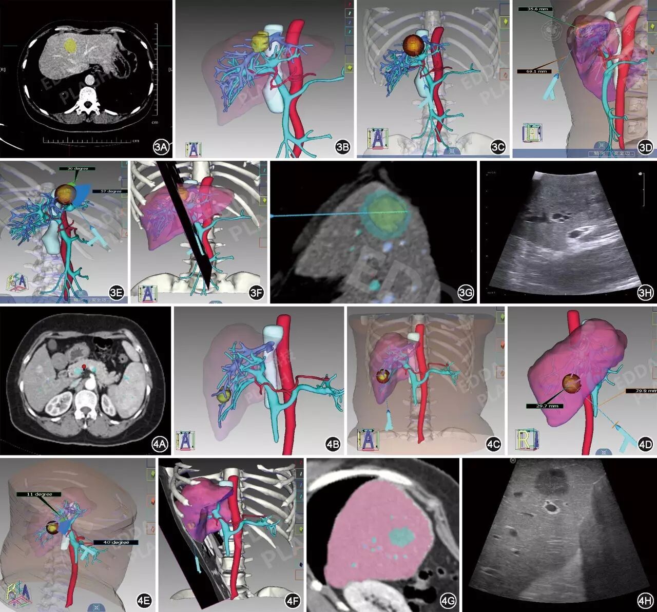 图4 IQQA®-Liver肝脏评估和介入治疗计划辅助系统对肝右前叶下段肿瘤行腹腔镜下射频消融术手术规划和术中超声检查图像:4A示术前影像学检查图像,可见肝脏肿瘤;4B示肝脏和肿瘤的三维重建图像,可见肿瘤位于肝脏右前叶下段,最大径约22 mm,前方为肝中静脉大分支,后方可见肝右静脉主要分支;4C示规划进针的三维图像:规划射频针于剑突旁进针,并调整针尖位置使射频范围完全包括肿瘤及安全边界;4D示模拟进针距离的三维重建图像:经肝脏表面进针29.7 mm;4E示模拟进针角度的三维重建图像:针道与水平面角度为40°,与矢状面角度为11°;4F示三维重建图像中经针道的重画割面;4G示三维重建中预计的超声图像;4H示腹腔镜超声探查图像,超声探头经剑突旁12 mm一次性Trocar进入