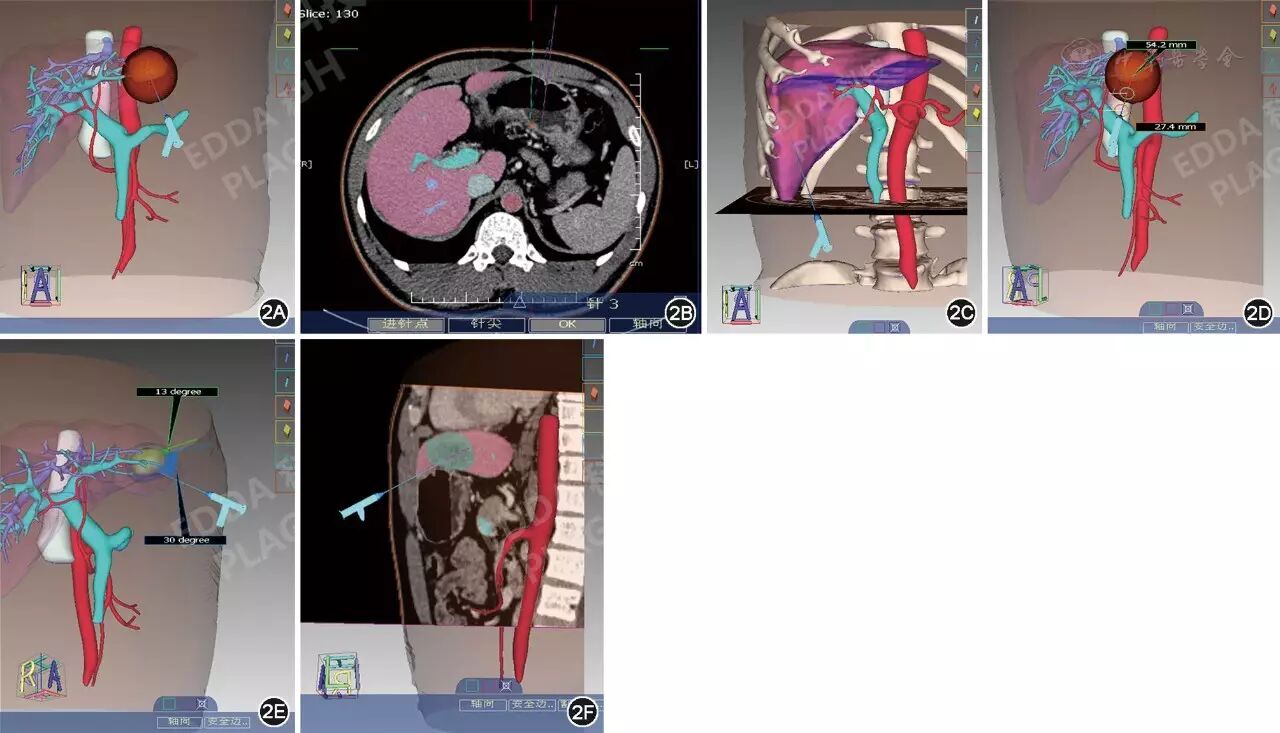 图2 IQQA®-Liver肝脏评估和介入治疗计划辅助系统对腹腔镜下射频消融术治疗肝癌行手术规划图像:2A示根据肿瘤大小选择合适的射频针;2B示设计进针点和针尖位置;2C示标记进针点的体表标记;2D示针道进入体表、肝脏的距离演算;2E示针道与轴面、矢状面的角度演算;2F示经过针道模拟腹腔镜超声的图像