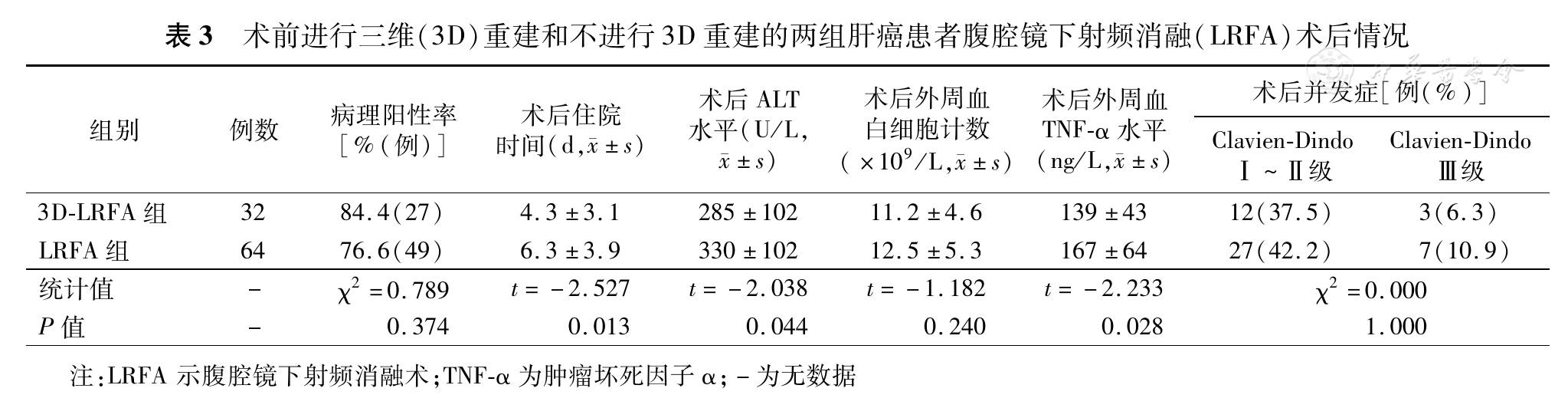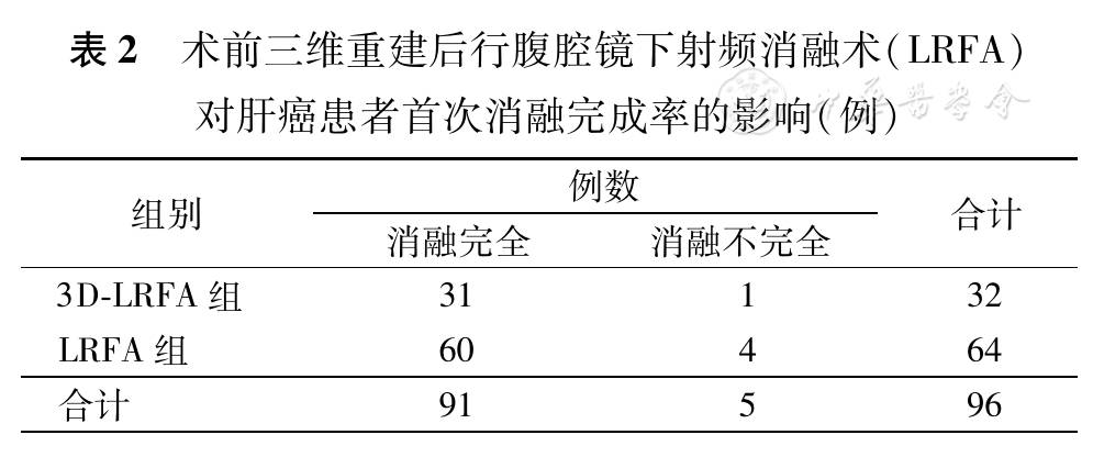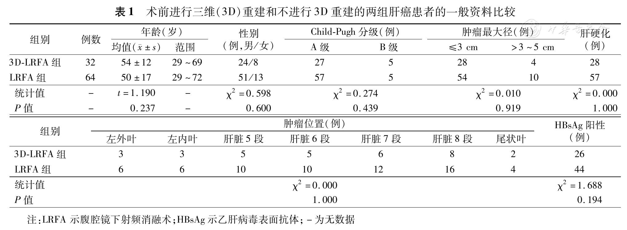 2014年1月至2015年12月我科连续对32例肝癌患者的肝脏进行三维重建,并根据三维重建模型进行术前规划,以指导腹腔镜超声(laparoscopic ultrasound,LUS)引导下的LRFA(3D-LRFA组)。根据32例患者的诊断、肿瘤部位、肝硬化程度、乙肝背景,按照1∶2的比例配对同期开展的未经术前三维重建规划的LUS引导下LRFA的64例患者资料(LRFA组)。两组患者的一般资料见表1,具备可比性(P值均>0.05)。