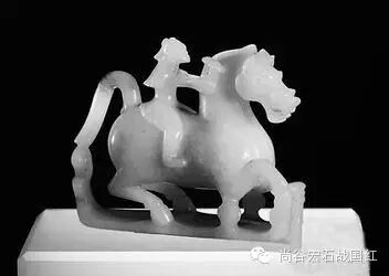 白如凝脂的和田玉精心打造而成,它昂首张口,竖耳挺胸,飞翼扬鬃,四蹄高抬,踏云乘风遨游于太空之中,马背上骑一戴巾生翅的仙人,手持灵芝,似正欲追寻极乐的天国仙界,充满奇幻迷离的浪漫气息。汉代曾从西域大宛获得汗血马,据说日行千里,号称天马,而两汉羽化登仙观念弥漫,仙人骑天马正是当时特定历史背景的如实写照。