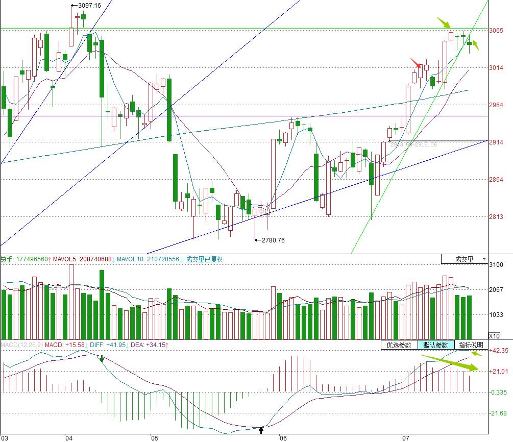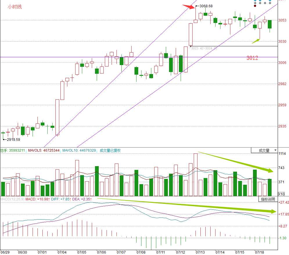 日线高位收出三颗缩量音星,周一收盘击穿MA5,macd柱线顶背离、diff线拐头,今日如不能收回MA5,则短期大概率进入第四浪调整。下方第一支撑3012点。