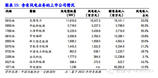重点推介个股:华能新能源(00958.HK)通过对重点研究公司的运营数据、财务指标的综合比较,结合各公司股价波动情况,我们给予华能新能源“买入”投资评级,目标价3.23 港币,相当于其2015 年每股收益预测的13 倍市盈率,主要推荐理由是公司有更好的资产质量、管理效率以及成长潜力。同时,我们认为龙源电力(00916.HK)有更强的技术实力以及更稳健的财务状况,给予“长期买入”投资评级,目标价7.76 港币,建议待股价回调后吸纳。而我们认为大唐新能源仍需要较长的时间来提高其盈利能力和降低过高的财务风险,给予其“中性”投资评级,目标价1.10 港币。