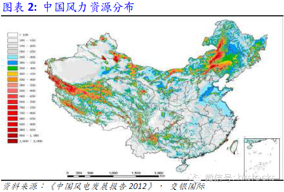 中国具有丰富的风能资源,开发潜力巨大。,如果考虑3级及以上(风功率密度≥300瓦/平方米)的风功率密度条件的地区可供开发,则全国陆上可供风能资源技术开发量为20-34亿千瓦。近海水深5-50米范围内,风能资源技术开发量为5亿千瓦,即在水深不超过50米的条件下,中国近海100米高度层达到3级以上风能资源可满足的风电装机需求约5亿千瓦。