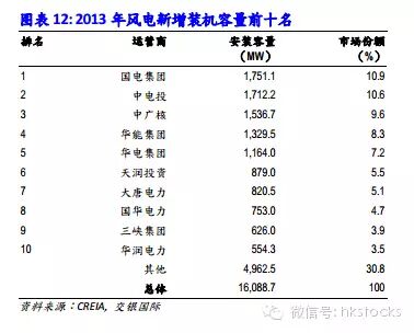 根据中国风能协会的统计,2013年中国风电新增装机16.1GW,前十名运营商总计新增11.1GW,占全国总安装量的69.2%。从累计数字来看,2013年底中国风电累计装机91.4GW,前十名运营商总计安装67.4GW,占全国总安装量的73.7%.