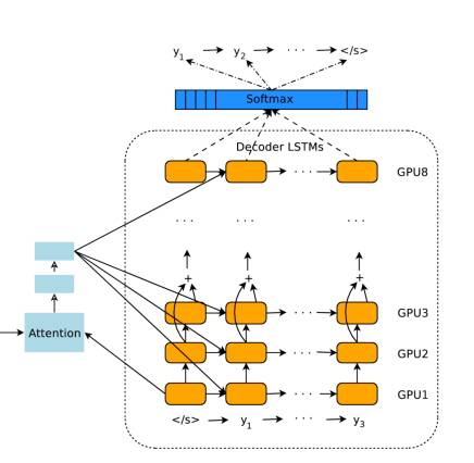 编码器产生一组有顺序的输出向量,然后它们被输入注意力模块和解码器的框架中。在很大程度上,解码器与编码器类似,在设计上都是堆叠的 LSTM 和残差连接。在这里细说一下不同的地方。