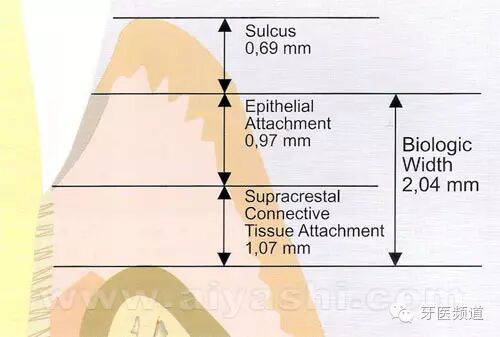 正常情况下,从龈沟底到牙槽嵴顶的距离是恒定的,该距离称为生物学宽度(biological width)。从牙槽嵴顶到牙龈边缘依次为附着龈、附着上皮及游离龈,其中附着龈与附着上皮即构成了牙的生物学宽度。国外统计数字表明:龈沟0.69mm、上皮组织附着龈0.97mm、结合组织附着龈1.07mm。游离龈中存有少量弹性纤维组织,健康的游离龈边缘可被移动,排龈可引起水平或垂直方向的龈缘移位。外国人的龈沟深度大于中国人,因此一般讲国人的牙齿肩台设置在游离龈上缘下0.3mm,这样既考虑了生理需求,又达到了美观需要。
