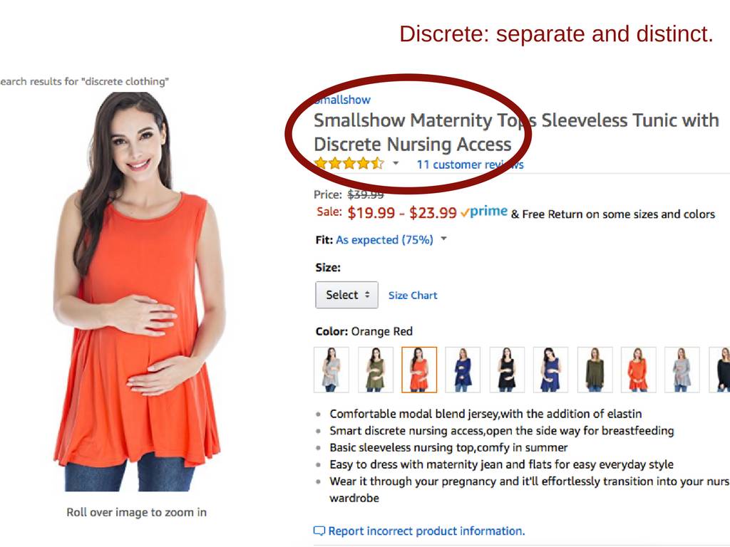 有些时候拼错单词也会闹笑话。亚马逊一个孕妇装上,情况就是如此。Discrete 意味着分离的、独立的。下面这个卖家本想使用的是discreet(隐藏,以免引起注意),看下面这个标题就觉得比较乌龙了。
