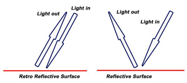夜间工作的建筑工人衣服上有一种反光带,我们通常把它称之为reflective tape(反光胶带),但实际上它是一种retro reflective tape(回射胶带)。这两个材质和原理都是不一样的,reflective tape更像是一面镜子,它反射出来的光是散向不同的方向。而回射光的方向只与原光一致。
