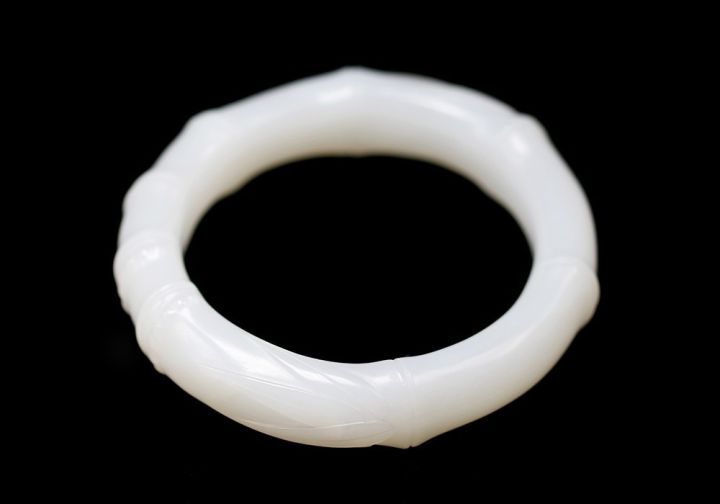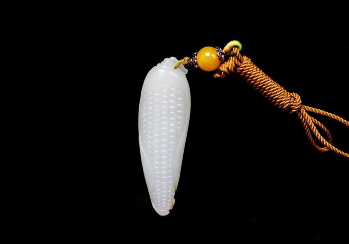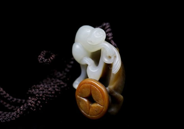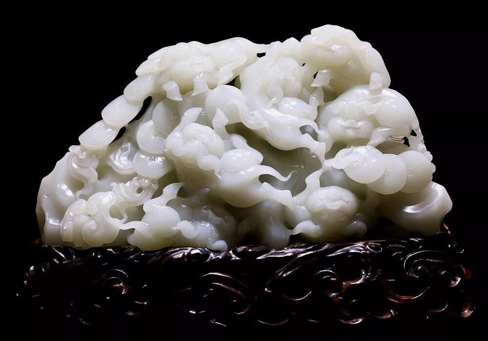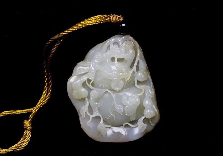 上佳和田白玉。采立体雕法,在原料天然之形中,精心构思、布局。作品刻有七只“福猪”,神态各异,嬉戏可爱之态跃然纸上。另刻铜钱于上, 使得作品既有雕工之精美,又寓福气满堂,合家欢乐,招财进宝之意,为玉雕佳作。