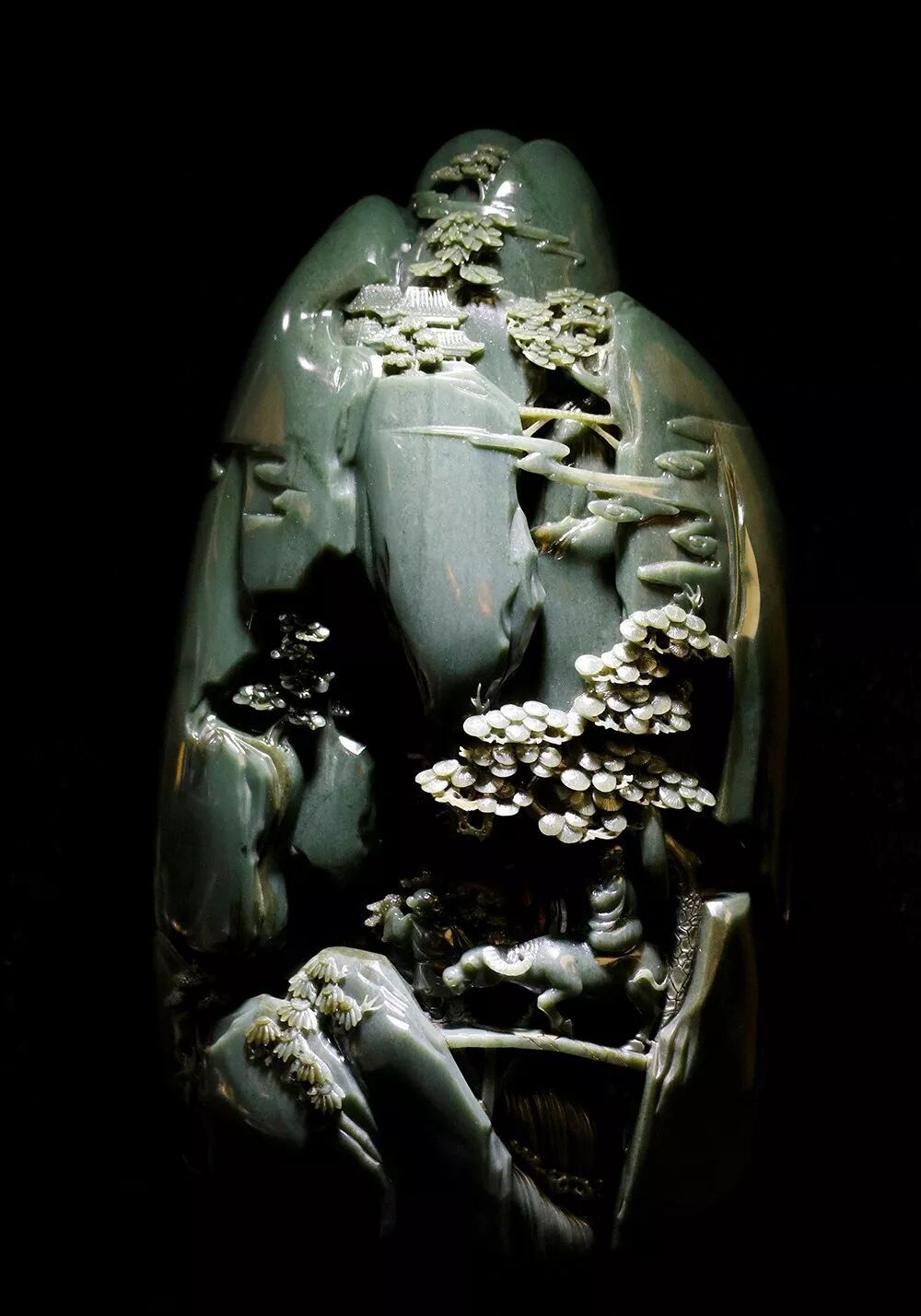 碧玉材质。本作是件较大的山子雕佳作。雕刻之功,已属一流。归园田居,自然离不开山林、松下、老者、牧童、牛、亭台楼阁、青山绿水……此作尽显。作品的整体视觉感让人舒适、倍感享受。这与作品的情景、意境有关,与作者的创作水平有关。好作,赏之。
