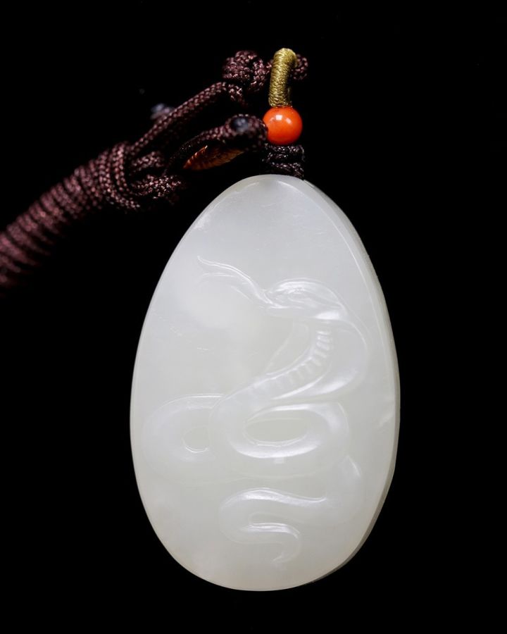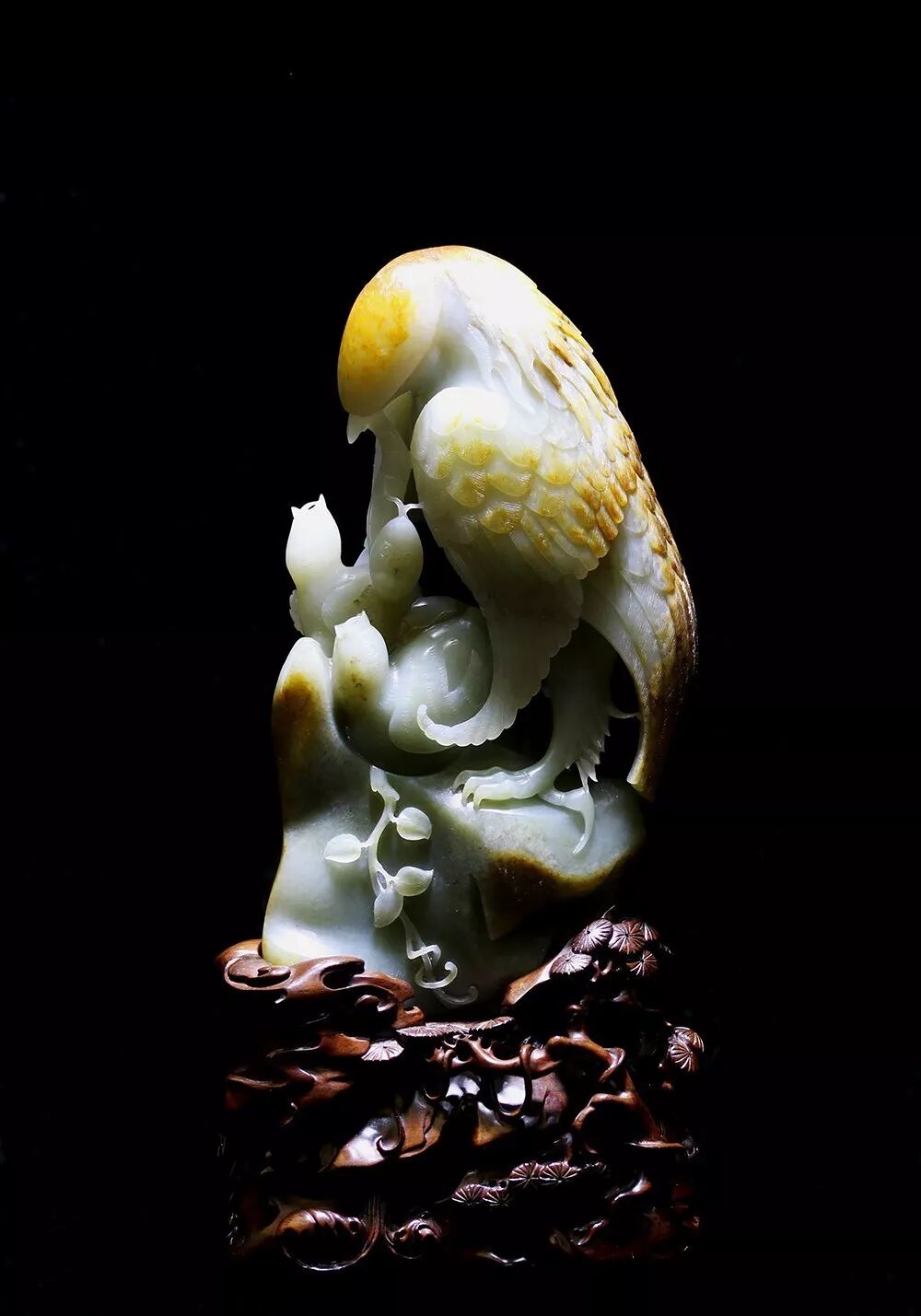 和田籽料。从作品的名称上亦可见温暖、温馨、感动。此作借用天然皮色,采立体雕为创作基础,在整体的雕刻设计上,在内容的表现方式上,颇为用心。作品雕工精湛,技艺不凡。老鹰捉蛇(食物)喂小鹰之景,彰显了母爱的伟大,让人动容。原色的合理化运用,亦为一亮点。作品寓意着鸿运当头、情真意切。