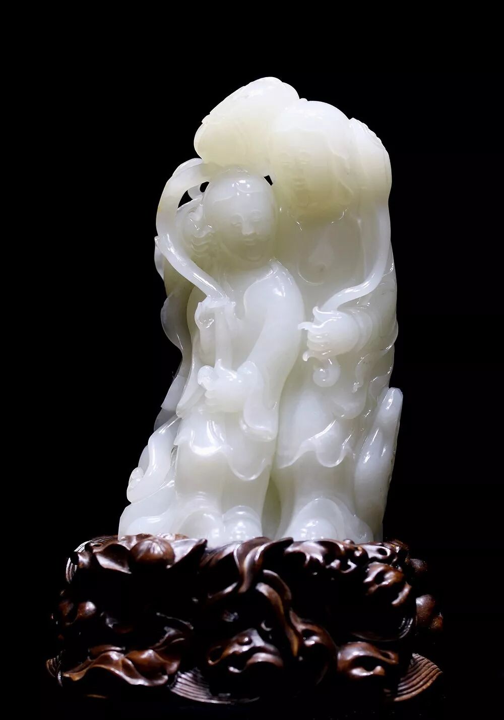 上好和田籽料。作品为代表性的传统玉雕题材。作者在人物的造型与刻画上尤见功夫。雕刻的精细度甚高。全作用立体雕手法,将作品的视觉呈现效果与传统之意刻画至深。其荷香送远,合祥益清之境,让人感受到了真情、真心、和谐。寓意着永结同心,和美度一生。
