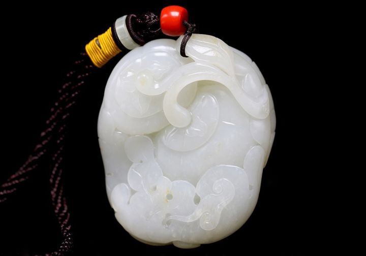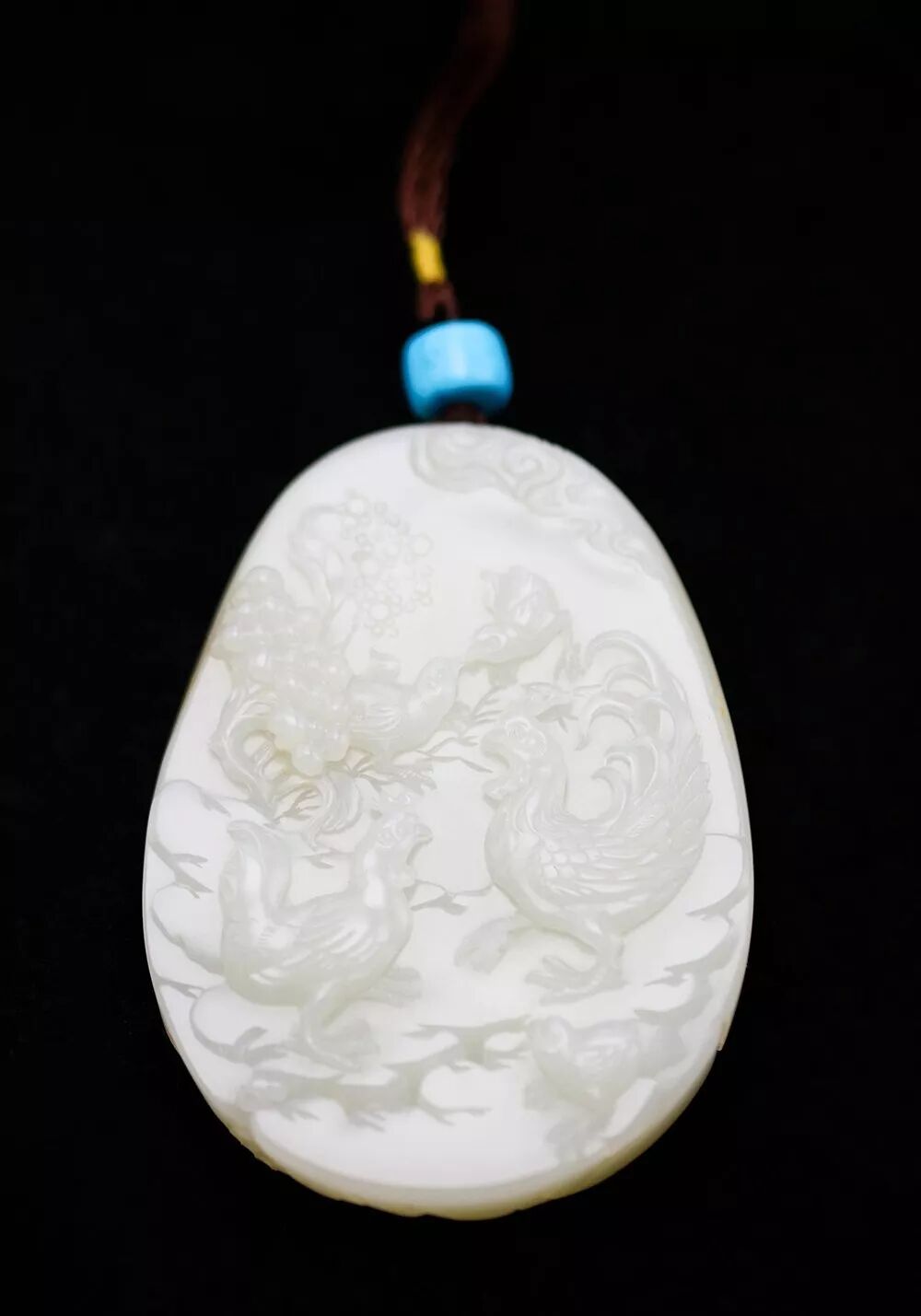 上佳和田籽料。浮雕,阳刻。作品通篇散发般的诗情画意,令人不由入境渐深。此作正面琢一贤士于松间花下吟酒作诗,上有凤凰祥绕,意飞黄腾达;背面刻有“荷塘月色”,意境唯美,使人陶醉。本作雕工之妙,观作可知。