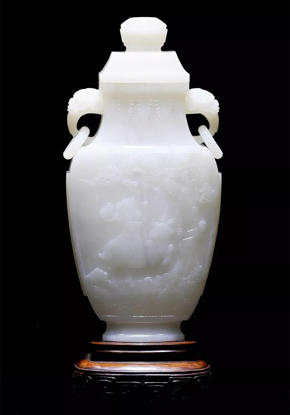 材质白玉。瓶身端庄大气。掏膛之艺与浮雕的运用,在此作品上已多方面展现,堪为上乘。作品雕有松树、如意、童子……童子与小羊戏耍之境,十分生动。瓶颈部双环、瑞兽与瓶体相融,自然谐调。此作较大,需作者有很高的玉雕艺术水平。单此作品而言以及。且过之。瓶,意寓平安,更具祺瑞吉祥之内涵。