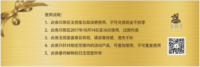 凡参加玉恒堂“国庆中秋八天乐”惠民活动,并购买产品获代金券者,均可在10月14日-16日期间,叠加使用所有代金券。