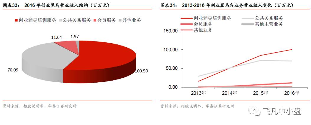 创业黑马是一家综合创业服务商,主营业务包括创业辅导培训、公关服务、会员服务、创业资讯等,其中创业培训服务是公司业务的主体,其他业务都是逐渐衍生的产品。2016年,公司创业辅导培训收入占总收入的54.56%,毛利占总毛利的比例超过60%。创业黑马的创业辅导培训业务具有三个特点:多种类、高质量、高收费。