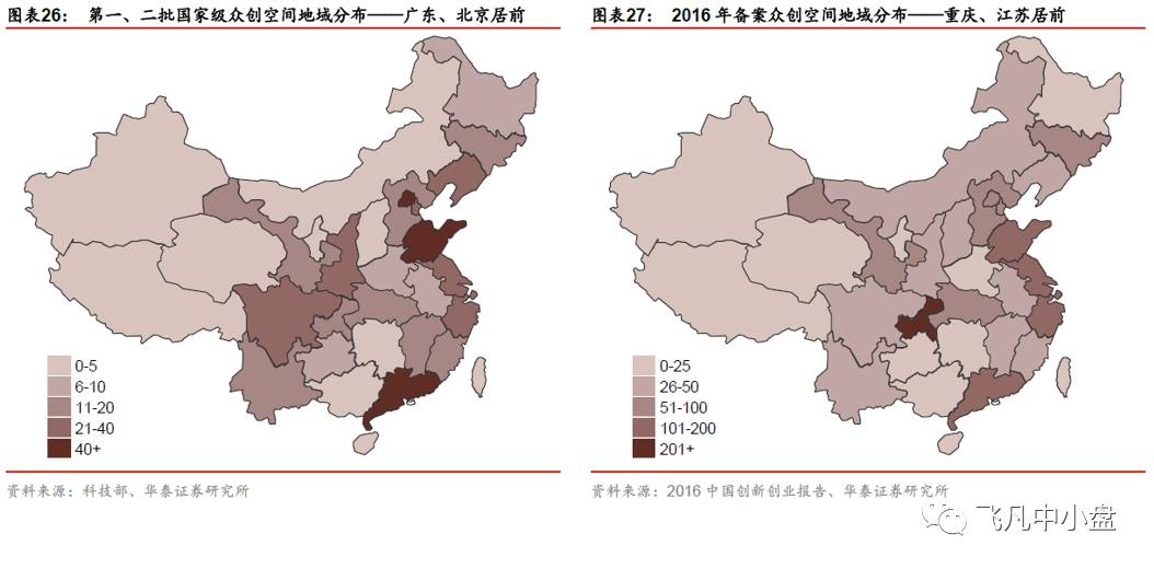 创业服务在一线城市已相对饱和,而在二、三线城市还存在较大发展空间,低线城市化是必然趋势。从创业公司数量看,2016年新成立创业公司北京、广东、上海分别占比31%、20%及16%,除广东外,另外两个城市均出现集中度下降趋势,紧随其后的浙江、四川及江苏等第二梯队省份创业热情升温明显;从新备案的众创空间数量看,2016年,重庆、江苏分别备案众创空间280、179个,超过广东、北京、上海等一线城市所在省市的备案数量;从创业服务产业的成熟度看,北上广深等一线城市已具有各种类型的创业服务公司,天使、VC投资机构密集,而其他城市创业者可得到的服务仍有限。