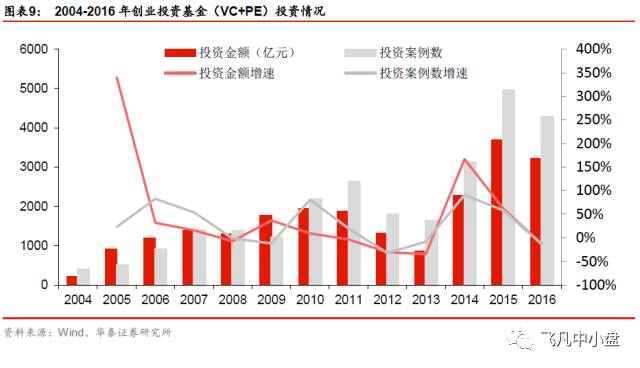 投资热度不减,资本与创业者趋于理性。根据Wind数据库,2016年我国股权投资基金(VC+PE)的投资金额与投资案例数相较2015年均有所下降,但整体仍高于历史平均水平。从单次投资交易的平均投资金额来看,最高为2005年的1.85亿元/笔,近三年逐渐趋稳,约为0.75亿元/笔,说明我国创业投资机构和创业者逐渐趋于理性,不再一味追求企业的高估值,大部分项目的估值维持在一个合理的区间。