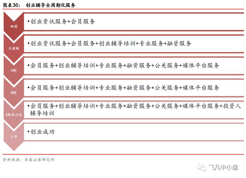 具备多元服务能力的综合性公司更有可能脱颖而出。在之前的分析中我们提到,创业辅导全周期化、业务综合化可能是创业服务行业未来的重要趋势。为客户提供全生命周期的服务将有效提高客户粘性、提升单客户价值;目前创业服务市场优质导师、课程等服务资源稀缺,若创业服务公司仅开展单一的业务,资源的外溢性将会很突出,行业内很多领先机构也均采用了多元化服务的模式。因此我们相对更看好具备全生命周期以及多元化服务能力的业内公司在未来的竞争中胜出。