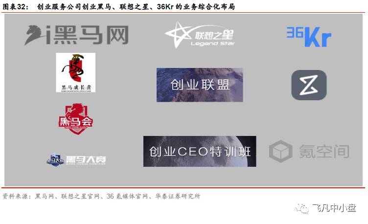 我们认为行业内领先公司会向包含多种服务类型的综合性创业服务公司方向发展。目前创业服务市场优质导师、课程等服务资源稀缺,若创业服务公司仅开展单一的业务,资源的外溢性将会很突出。因此,目前市场上各种类型的创业服务机构基本都采取了多业务的发展策略,以创业黑马为例,其主要业务包括创业辅导培训、公关服务、会员服务等;以联想之星为例,其主要业务除了融资服务,还设有创业CEO训练营、创业联盟;以36氪为例,其在媒体服务的基础上,还以“氪空间”品牌经营联合办公业务、以“36氪创投”品牌经营融资服务。可以预见,为更好地利用稀缺的上游资源,发挥各业务间的协同作用,越来越多的创业服务机构将使用综合化业务策略。