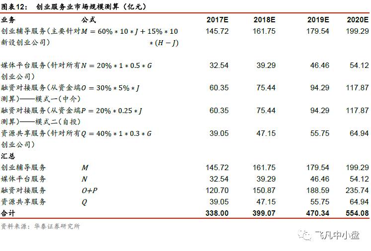 在以上各个假设的基础上,首先计算出2017-2020年每年新增创业公司的数量、取得融资的新增创业公司数量、创业公司总量和创投资金总额。参考行业内代表性公司创业黑马的各项业务收费情况,考虑到创业黑马市场地位较高、掌握的上游资源显著优于行业平均水平,我们将公司各类业务的收费予以一定的折扣作为参考。此外,对于初创企业,是否取得融资对其选择创业服务类型有较大影响,所以我们针对创业辅导服务这一部分的规模测算,分为2%取得融资的新增创业公司和98%未取得融资的新增创业公司,并分别设定不同的渗透率。最终测算结果表明,2017年-2020年,创业服务市场的规模分别为338.00亿元、399.07亿元、470.34亿元、554.08亿元,CAGR为17.91%。