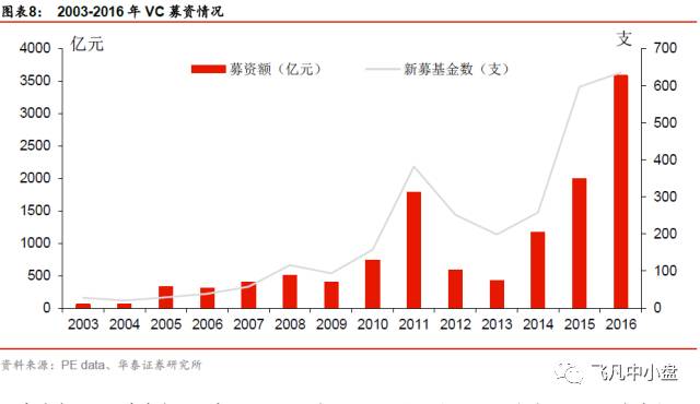 创投募资市场活跃,大额基金频频设立。根据私募通VC募资数据,2016年中外创投机构共新募集636支可投资于中国大陆的基金,同比微升6.5%,已知募资规模的545支基金新增可投资于中国大陆的资本量为3581.94亿元人民币,同比上升79.4%。2016年中国创业投资募资市场十分活跃,大额基金频频设立,例如国新控股、邮储银行、建设银行、深投控股共同出资设立中国国有资本风险投资基金,主要投资于企业技术创新、产业升级项目。