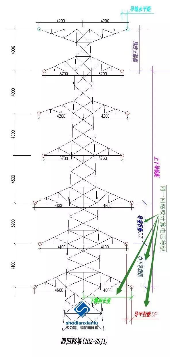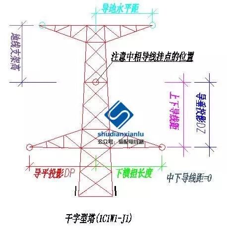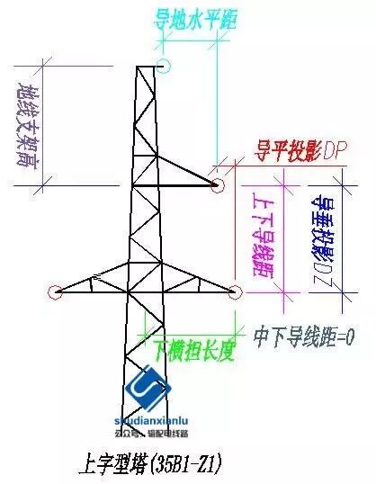 【释意】:以上参数取值根据杆塔参与取值,当多回路时【导平投影DP(m)】与【导垂投影DZ(m)】取回路中值最小值回路的数值,如果两值存在不同回路中计算平方根最小值,这样是保证电气距离一定满足。为经济性考虑也可以按实际杆塔参数人工校核。取值图例可以参考小编下面的杆塔参数图例。