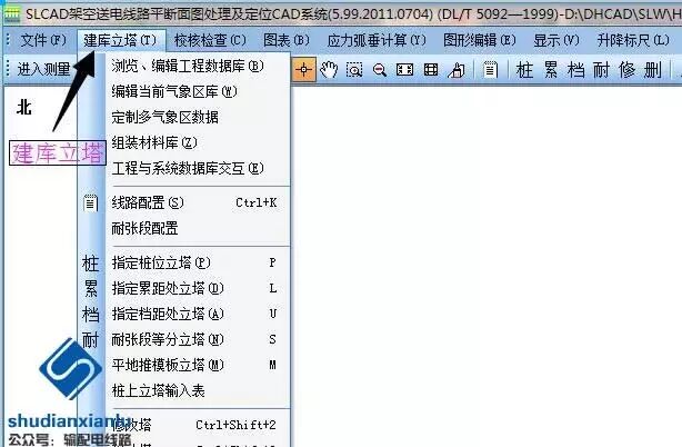 打开《SLCAD架空送电线路平断面图处理及定位系统》软件后,点软件标题栏的【建库立塔】菜单,出现如下界面: