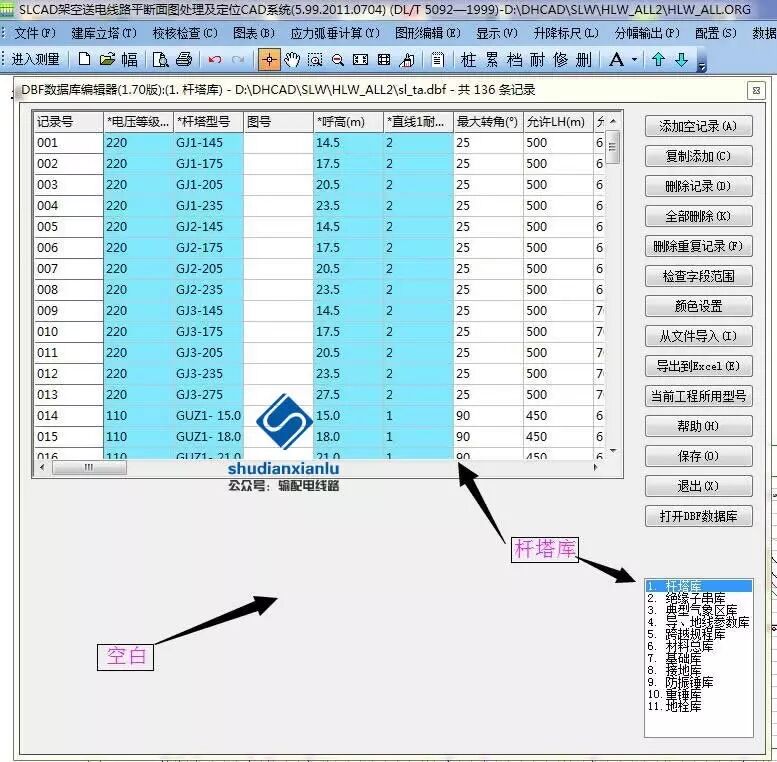 然后点击【浏览、编辑工程数据库】菜单后出现如下界面。界面的左侧上部位杆塔库,下部为空白,右侧上侧为编辑菜单,右侧下侧为为相应的工程数据库,第一个为今天我们要介绍的杆塔库。