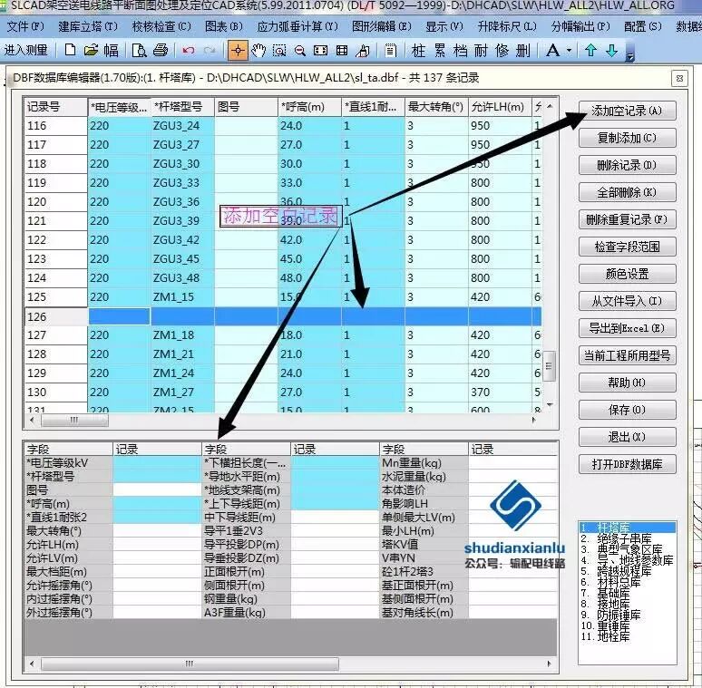 当我们要新建议个塔型库时,点击右侧下方的【杆塔库】,出现杆塔库界面后点击右上侧【添加空记录】,然后在左上侧出现一个空白栏,左下侧出现空白参数栏,然后我们就可以在左下侧输入该杆塔的参数。如下如所示: