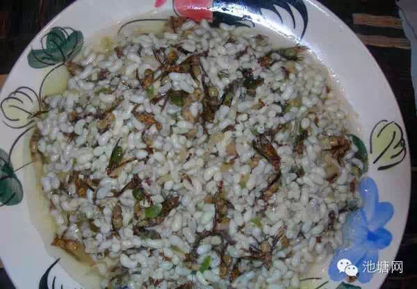 蚂蚱,就是我们常说的蝗虫,就是这样普通得不能再普通的虫子,我们这里的人美其名曰:“跳菜”好形象呀~~将捉了的蚂蚱带回家,用开水一烫,去掉翅膀,和腿足,在锅里慢慢烤黄,烤到水分干涸,焦黄灿然的时候,加上香油,花椒调料,黄生生的蚂蚱,便透出诱人的香气。那香劲才叫无法形容,清脆中有一股子谷草的清香气味。“有朋自远方来!”的时候,炒上一盘,弄上二两小酒,嚼着清香的油炸蚂蚱,述说着人间的深情厚义,那才叫神仙过的日子。