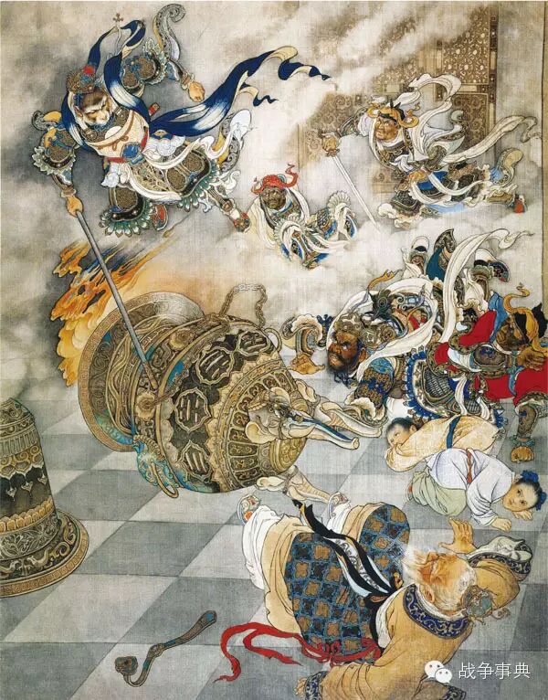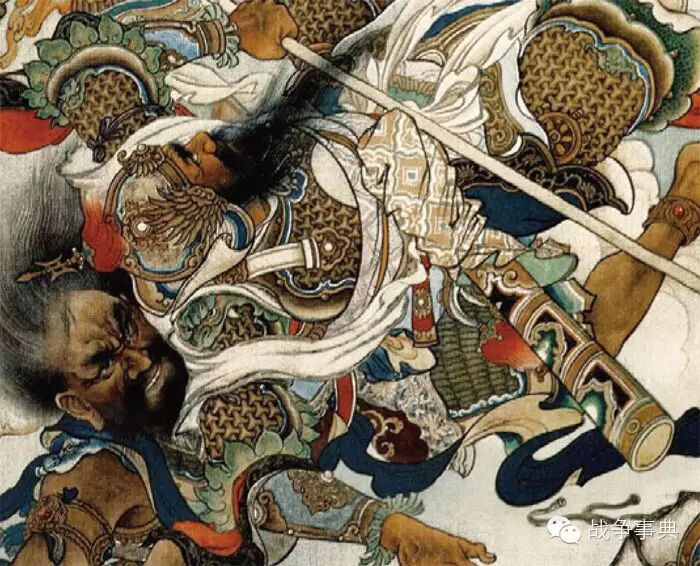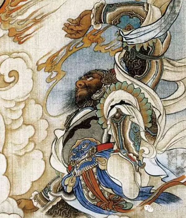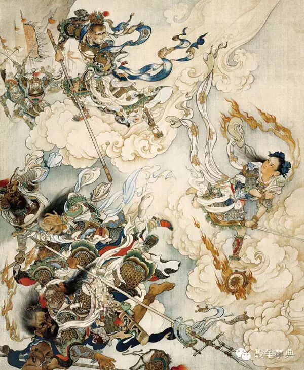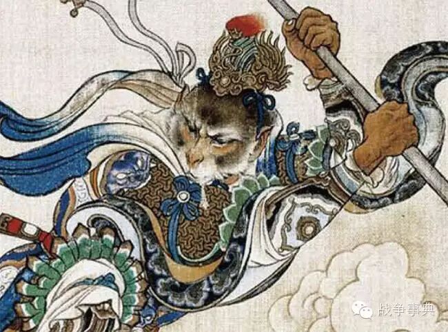 在这幅作品中可以清楚地在孙大圣身上看到束腰、抱肚、肩腹部兽吞等中国甲胄所特有的附件,所有披甲人物的披膊都以丝绦牢牢绑在臂膀上。