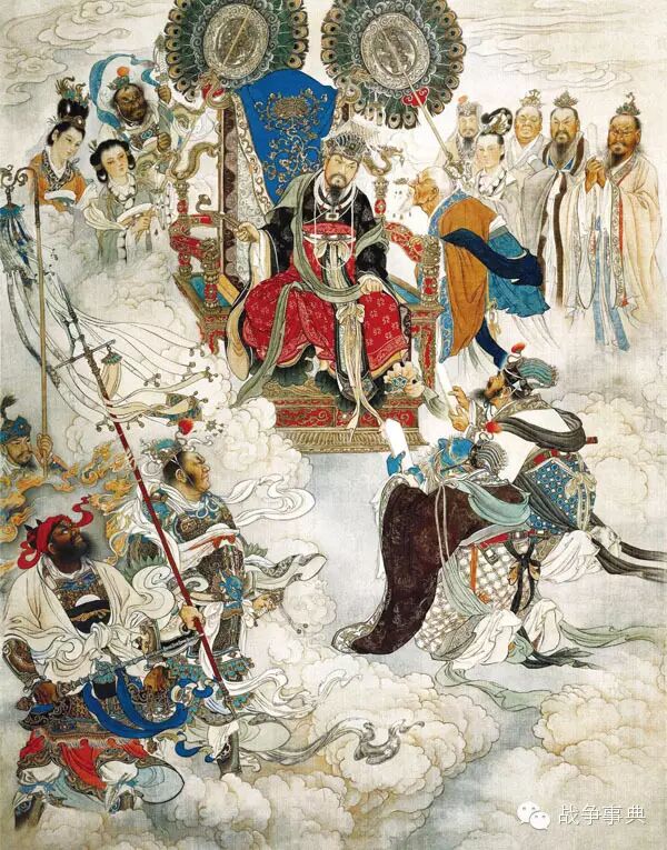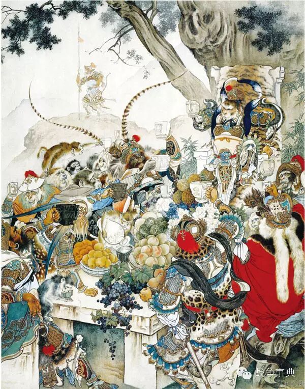 我国连环画鼻祖,有“当代画圣”之称的刘继卣先生曾于1956 年创作过一套名为《闹天宫》的工笔组画,全套包括《石猴禀义天庭》、《弼马温怒扫山中》、《齐天大圣战神兵》、《蟠桃园内问真情》、《醉能瑶池食仙丹》、《下界为王会新朋》、《火眼金睛千钧棒》、《大闹天宫立轴》八幅单张画卷。其中《石猴禀义天庭》、《齐天大圣战神兵》、《下界为王会新朋》、《火眼金睛千钧棒》、《大闹天宫立轴》五张画作中,都出现了中国传统甲胄形像。尤为可贵的是,在创作这套作品前,刘继卣老先生查阅过大量中国甲胄资料,这些甲胄有札甲、鱼鳞甲、山纹甲,它们形制各异,但穿戴方法和甲胄配件在历史上都真实存在过,并无胡乱想象发挥之处。所以虽然它只是美术作品,但对我国甲胄附件装饰研究却有着很重要的意义。