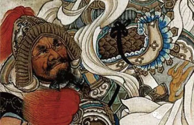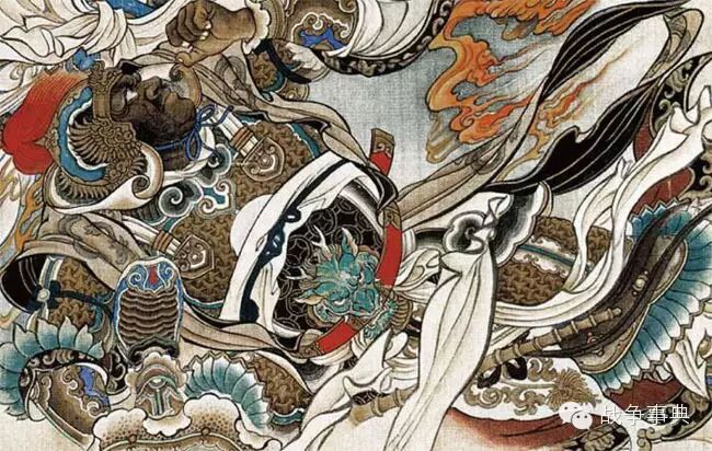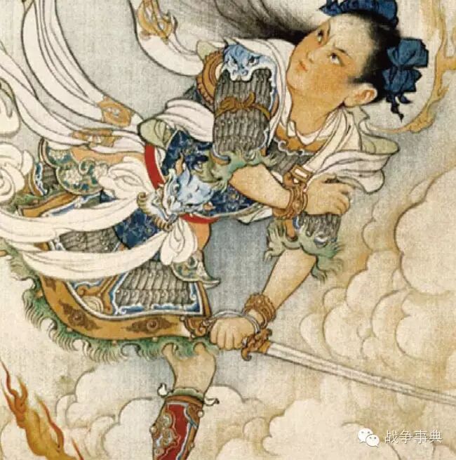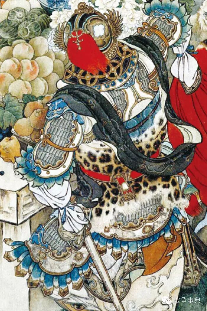 在这幅作品中可以看到中国甲胄所配套的护腕、护胫以及下裙、披膊上的莲花与荷叶形包边装饰。