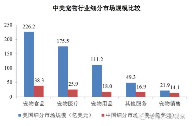 市场仍有差距,随着宠物消费服务升级以及社会的关注,预计我国宠物医疗市场 份额将稳步提升。据美国宠物产品协会(APPA)统计显示,中国各宠物细分市场 较美国市场存在巨大差距,其中宠物食品、宠物医疗的差距尤为明显。![]() 数据来源:美国宠物产品协会(APPA)