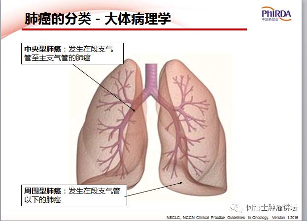 肺癌分类方面,按照原发肿瘤发生的部位来看,,其区别在于前者发生在段支气管至主支气管,后者发生在段支气管以下。