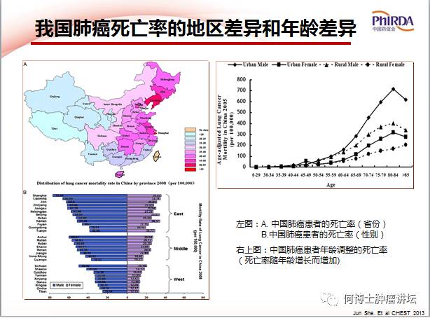 我国幅员辽阔,人口分布不均,因此肺癌的发病也有地区差异,呈现出东高西低的趋势。同时肺癌死亡率跟经济发达程度有相关性,经济发达区域肺癌死亡率高于经济欠发达地区,城市人群肺癌死亡率高于农村人群。从年龄上来看,随着年龄的增加,肺癌的死亡率逐渐增加。