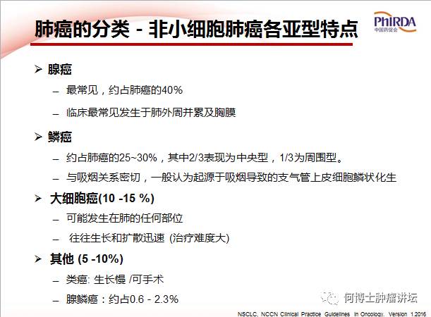 腺癌多见于不吸烟的女性患者,在NSCLC中所占比例最高,也是目前可用治疗药物最多的一类亚型。