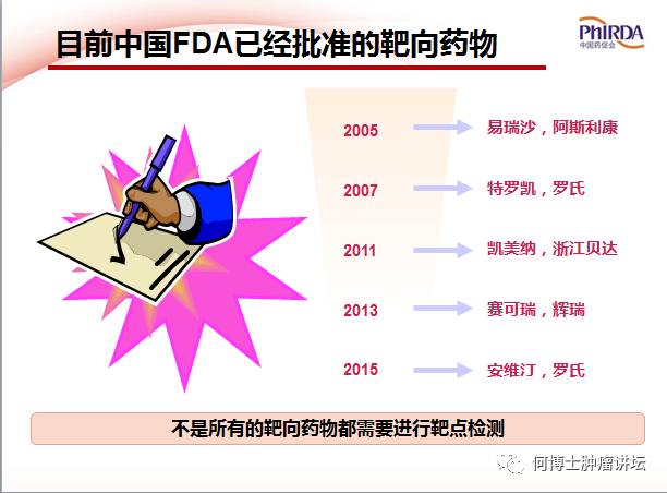 目前中国已经批准的肺癌靶向药物有易瑞沙,特罗凯,凯美纳,赛可瑞和安维汀。其中大部分药物都需进行靶点检测,也就是说需要先明确肺癌患者的某种特定基因存在突变或扩增,明确之后再选用靶向药物进行治疗,才会得到更好的治疗疗效。抗血管生成的靶向药物比如安维汀则无需进行基因的检测。